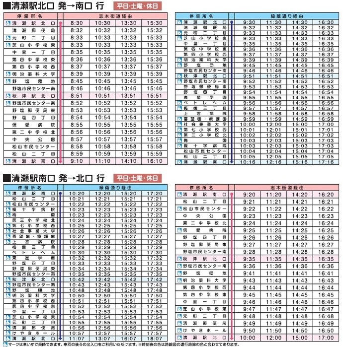 清瀬駅北口発は毎時30分発、清瀬駅南口発は毎時20分発です。